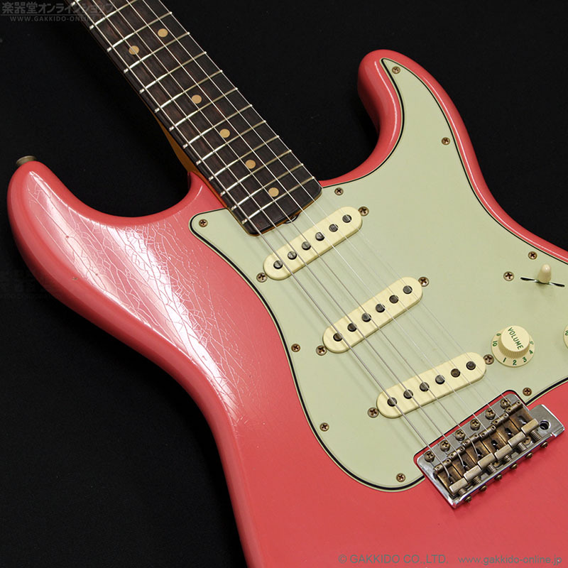 お馴染みのフィエスタレッドが経年変化によりややピンク系カラーに変化した感じが再現された、とても特徴的なルックスのギターです。