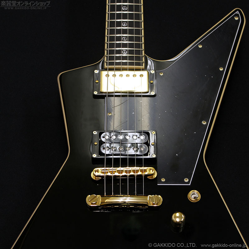 EX系オリジナルシェイプのバインディング付きマホガニーボディ、マホガニーネック&22Fエボニー指板(指板インレイはピースマーク!)。指板サイドポジションマークはステージでの視認性に優れた蓄光タイプです。