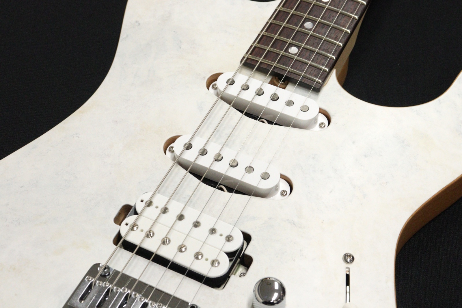 ボディベースにはユーザーからの人気の高いS-622を採用。STタイプのボディシェイプをベースに、モダンアーチトップと呼ばれる緩やかな曲線のトップを用いた、SAITOギターのラインナップの中でも高い人気を誇るモデルです。ボディには選定されたアルダーを使用。本体重量3.16kgと軽量で取り回しの良いボディバランス。今回ボディカラーに使用した "White Granite"はSAITOギターの中でも クラスSに分類される特別な仕上げ。グラナイト (花崗岩)をイメージした結晶の斑点のような特別な模様により、まるで石材のような滑らかな外観に仕上がっています。こだわりのマッチングヘッドカラー&ホワイトピックガードカバーを採用することで統一感のあるルックスに。黒々としたローズウッド指板により引き締まった精悍な印象の1本に仕上がりました。
