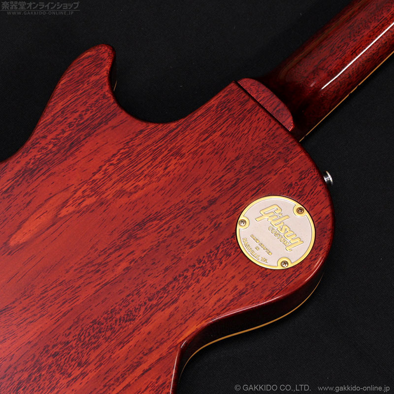 非常に細かく深いフレイム模様がびっしりと入った素晴らしいフレイムメイプルが美しく映えるウォッシュド・チェリーサンバーストカラーのVOS仕上げ。ピックアップはカスタムバッカー(アンポッテド)を搭載。