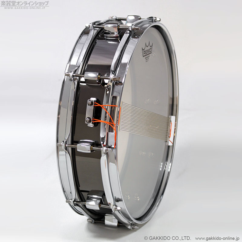 口径14インチながら深さ3.5インチのピッコロスネア。1mm厚のブラックニッケルフィニッシュ仕様のスチールシェル。1.6mm厚のスチールフープを装備。