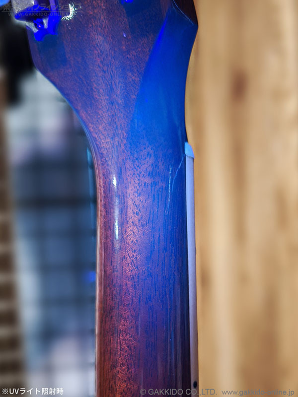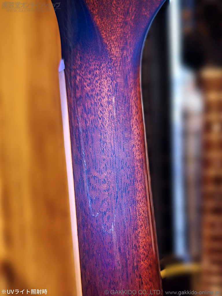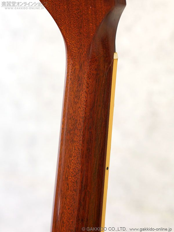 ナット裏から3F付近にかけてネック折れの修理跡が見られますが、写真のとおりよく見ないと分からないくらいにきれいにリペアされています。また、おそらくそのリペアの際にボディトップ以外がオーバーラッカーされているようです。※ボディトップはオリジナルの塗装とみられます。
