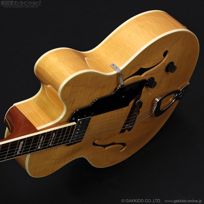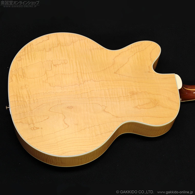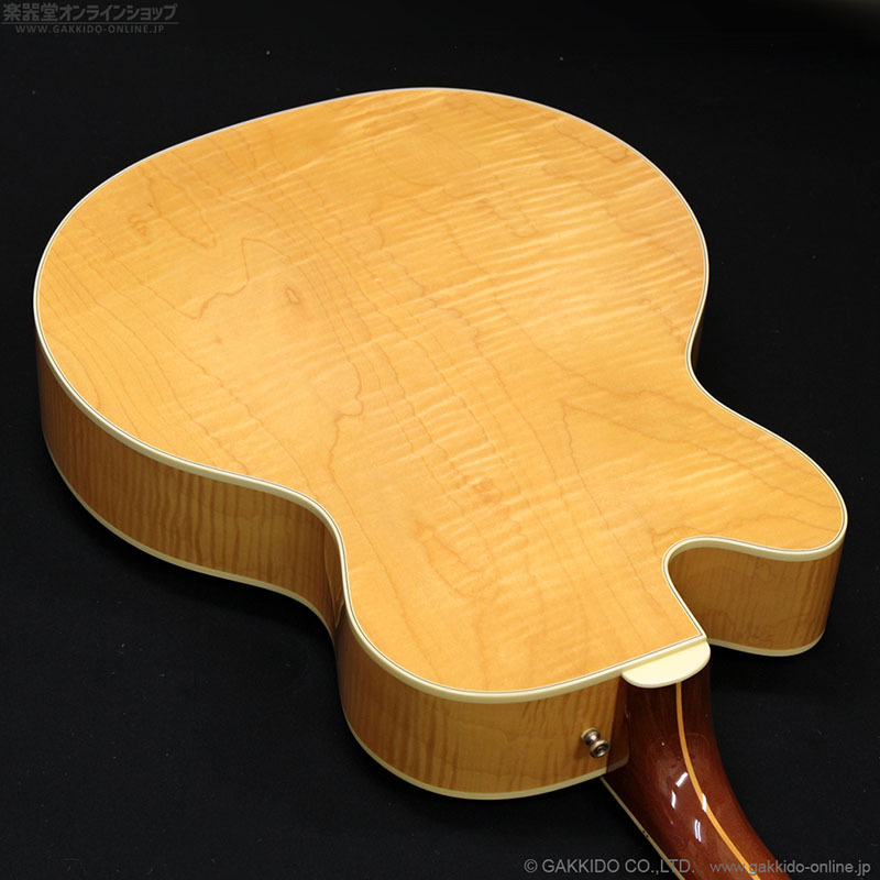 フレイム模様が美しいラミネート・メイプル製シングルカッタウェイ・ボディ(16インチサイズ)に、オリジナル・ハムバッカーを1基搭載した伝統的なフルアコのスペックを持っています。