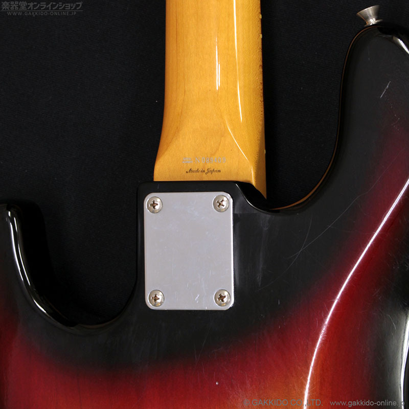 シリアルナンバーや仕様などから見て'93〜'94年製のフェンダージャパンJB62-58の中古品。バスウッドボディ、オーバルシェイプ・メイプルネック&20Fローズウッド指板。赤みの強いべっ甲柄ピックガードが映える、定番の3トーンサンバーストカラーです。