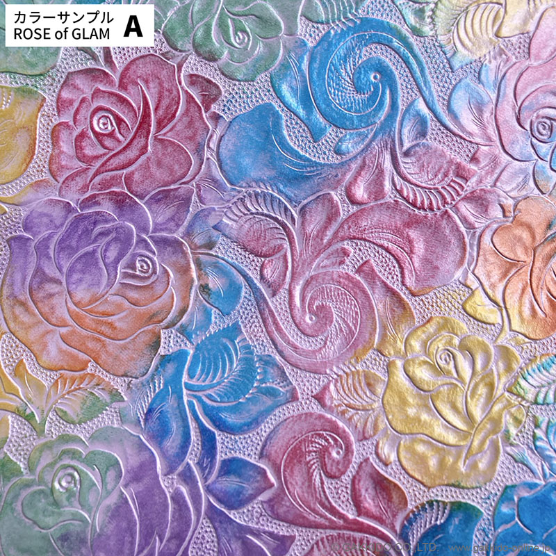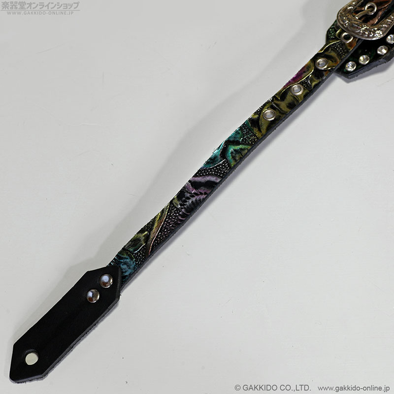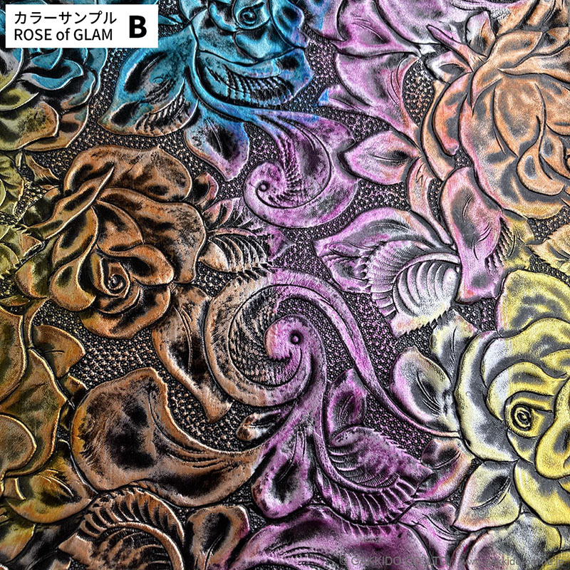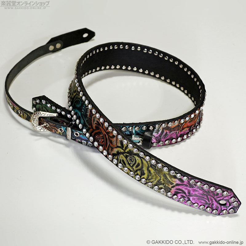 こちらは様々なカラーを取り入れた薔薇模様の型押しメタリック革を使用し、その周囲をグラスストーンで囲んだ、まさにグラムロックの為のストラップ“ローズ・オブ・グラム”。カラーは2種類からお選びいただけます。