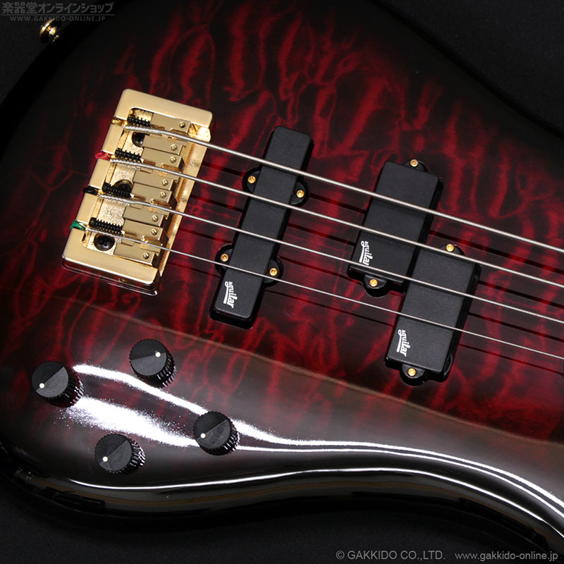 ゴージャスなキルトメイプルトップ&アルダーバックのボディに、3ピース・メイプルネック&24Fローズウッド指板をボルトオン。ピックアップにはアギュラー製オリジナルPJモデル、プリアンプにもアギュラーOBP-2を搭載した本格アクティブPJベースとなっています。