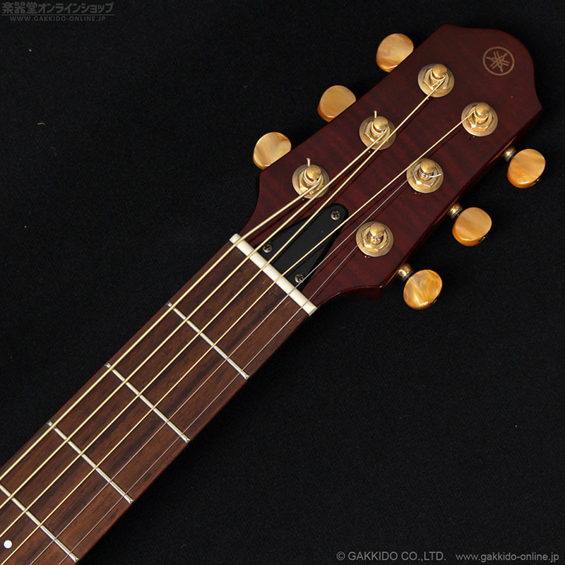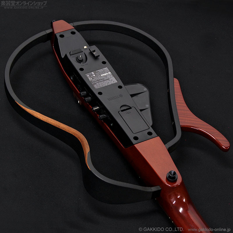 新開発のDSPを搭載、内蔵エフェクトもREVERBだけでなくCHORUSとECHOも加わったヤマハ・サイレントギターの第2世代モデルSLG110Sのボディトップ等に美しいフレイムメイプル材を配し、ボディの木部もグロス(艶有り)仕上げ(※通常のSLG110Sは艶消し仕上げ)となった高級感のあるSLG110S FMの中古品。2012年製。