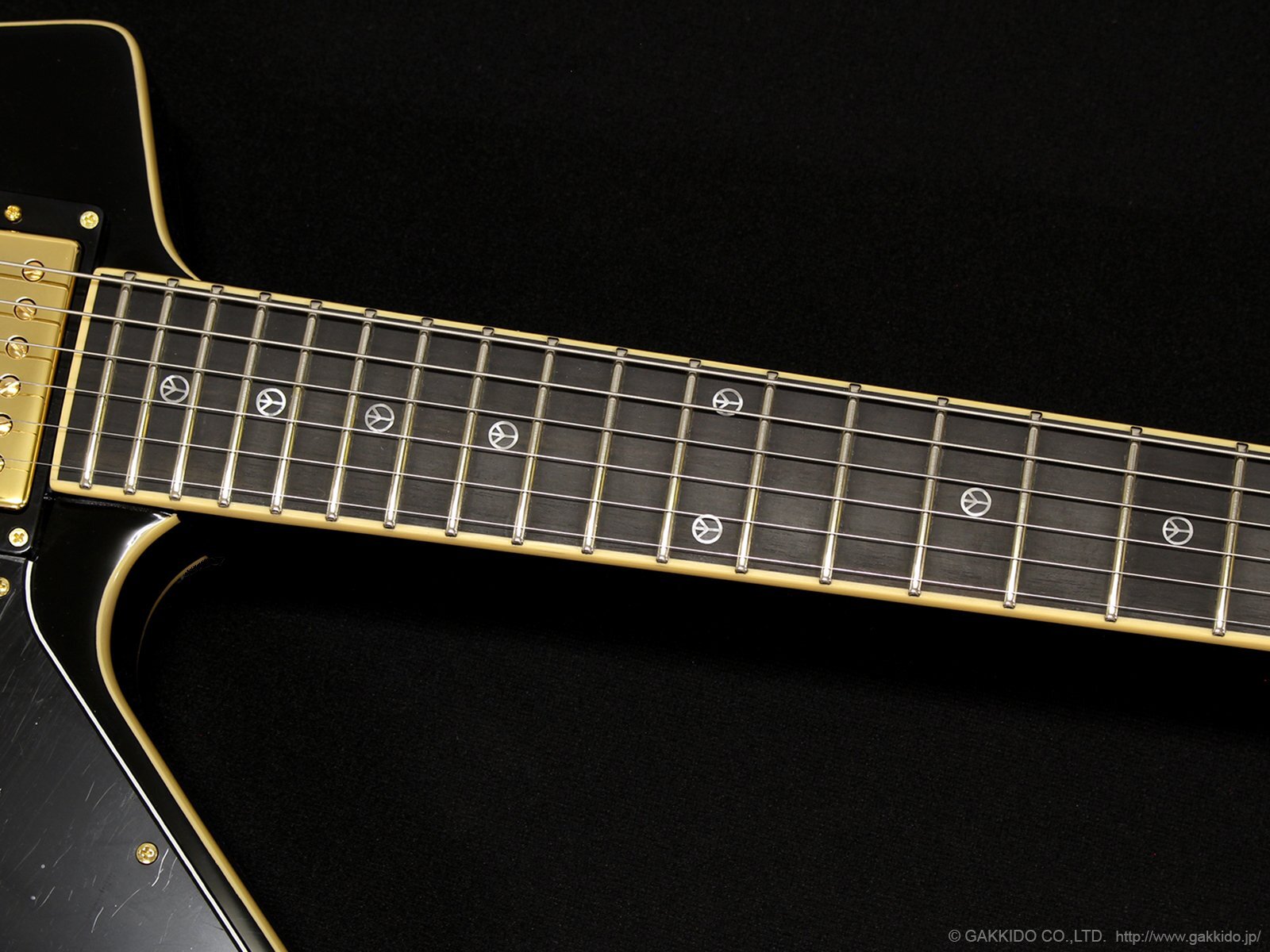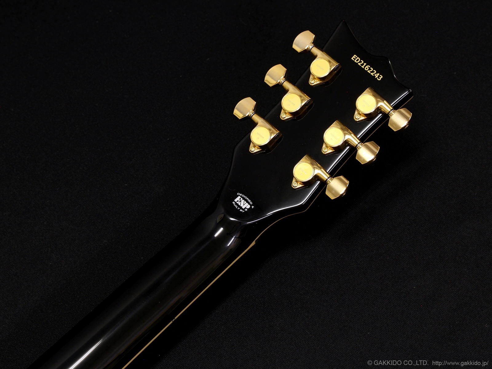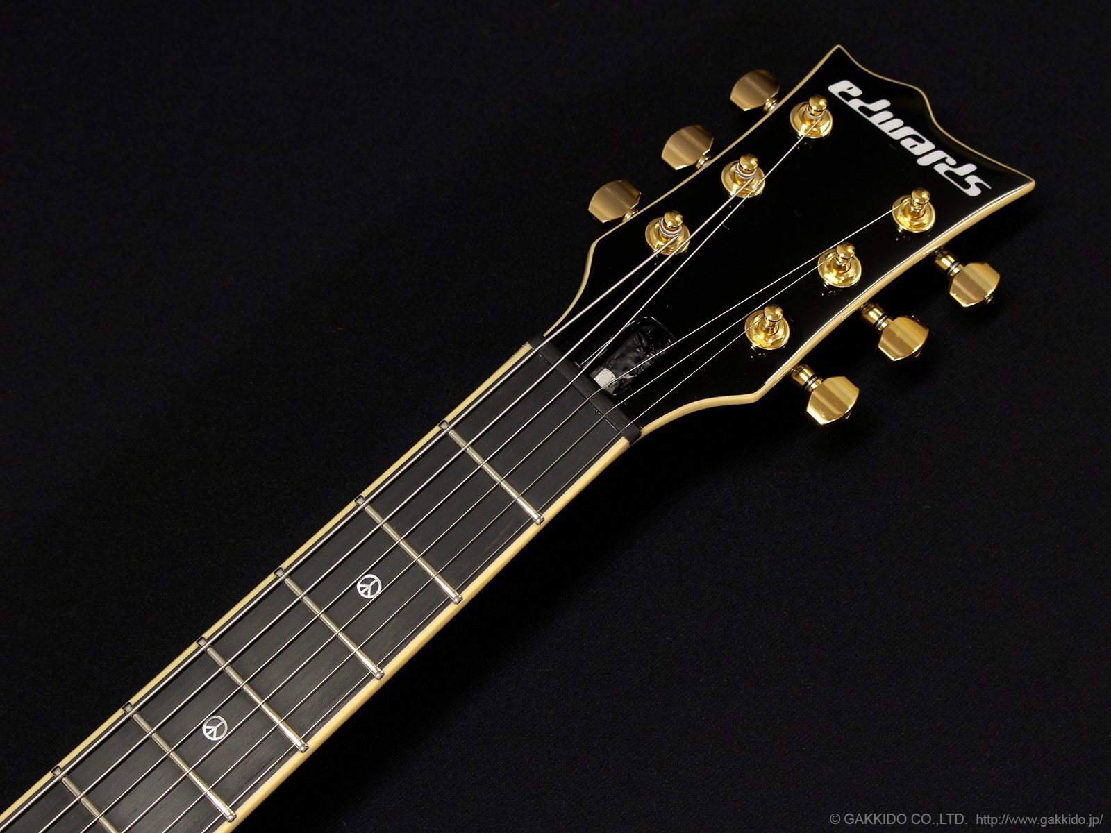 EX系オリジナルシェイプのバインディング付きマホガニーボディ、マホガニーネック&22Fエボニー指板(指板インレイはピースマーク!)。指板サイドポジションマークはステージでの視認性に優れた蓄光タイプです。