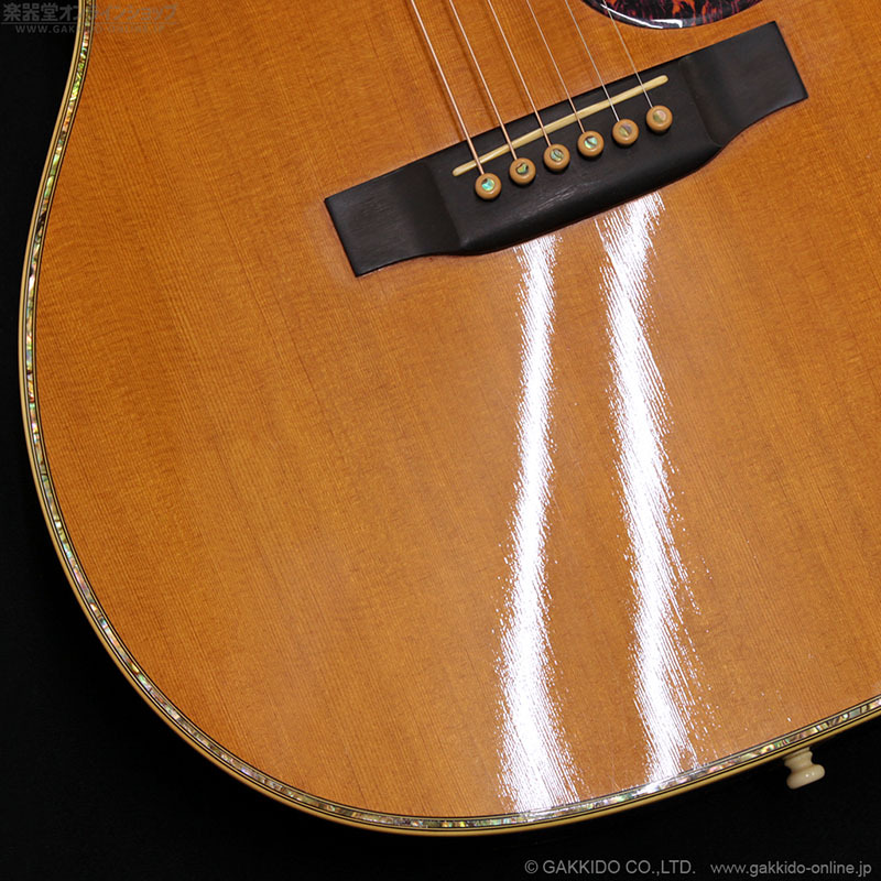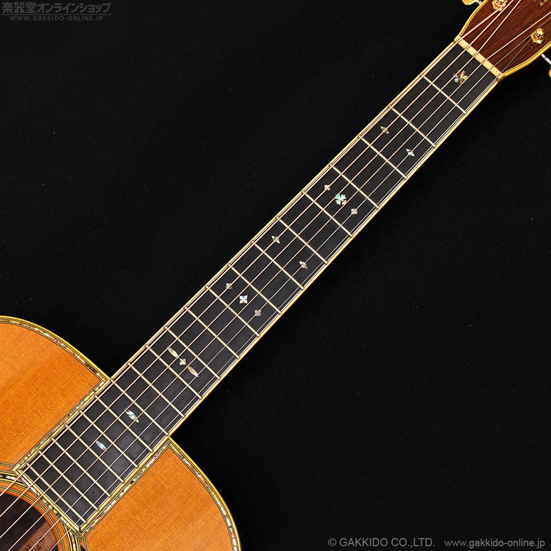 シトカスプルーストップ、インディアンローズウッドサイド&バック、モディファイドVシェイプネック&エボニー指板。ボディトップや指板スノーフレークインレイ、ヘッドロゴ等、随所にアバロン貝による緻密なインレイが施されています。