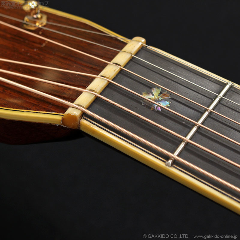 全体的にやや使用感があり、トップの色焼け、細かな傷、バインディングの継ぎ目の収縮などが見られます。フレットはやや減りが見られますがしっかりメンテナンス済みで演奏性は良好。ネックの状態も特に問題見られません。弦高は現状で6弦12Fが約2.5mm、1弦12Fが約1.8mmと弾きやすい状態ですが、サドルが低めとなっており、サドル出しろは6弦側約2mm、1弦側約1mmとなっています。また、3F辺りのネック裏に小さな塗装剥がれが見られます。