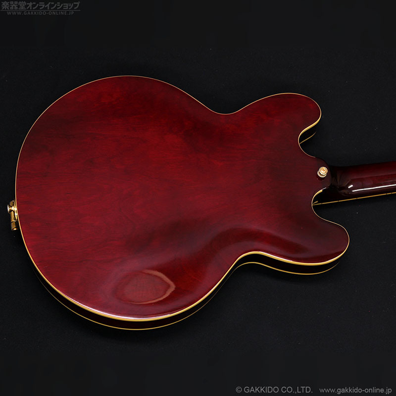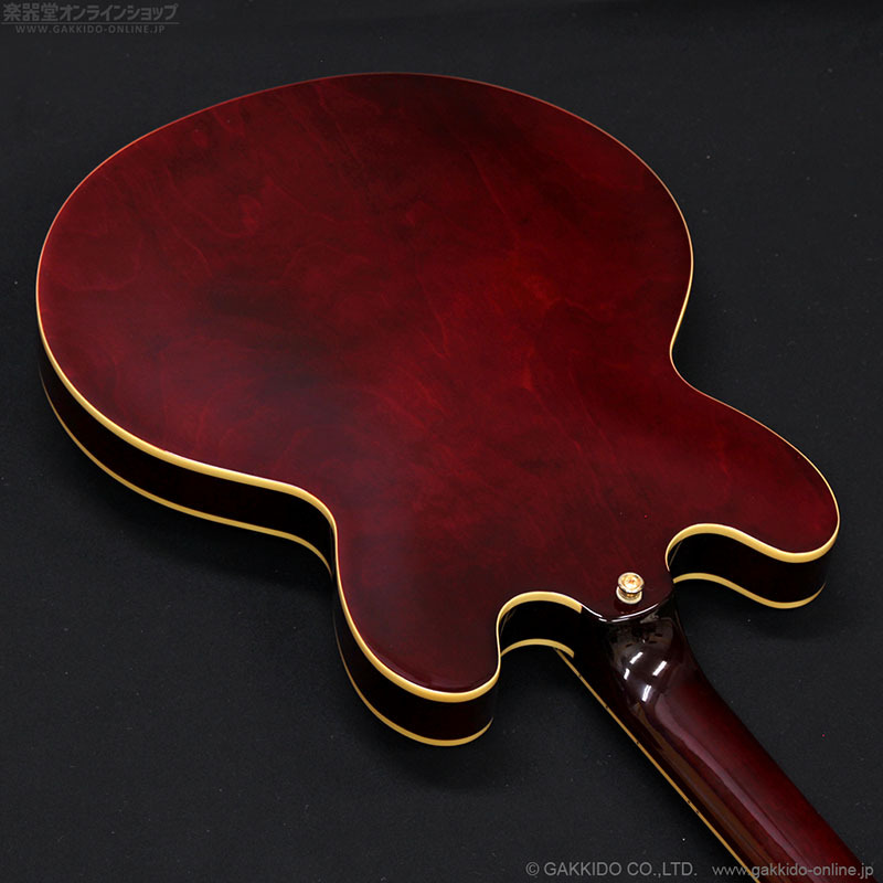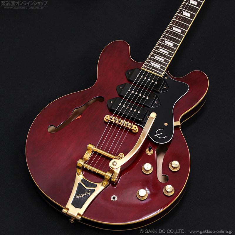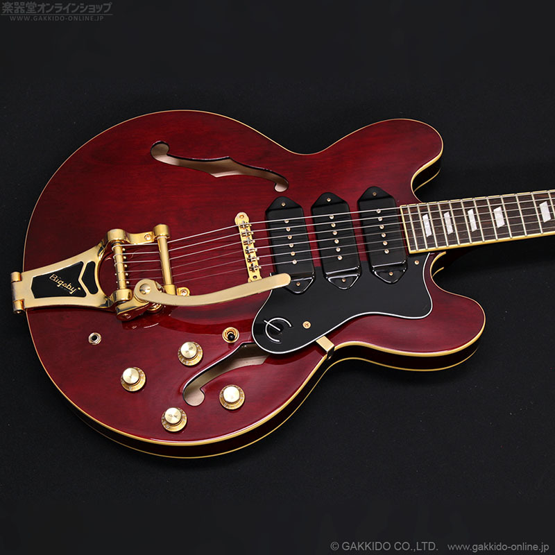 こちらはアルニコVマグネットを使用したエピフォン製P-90ドッグイヤーピックアップを3基搭載し、加えてビグスビーB70トレモロ、ゴールドカラーのハードウェアで仕上げたカスタムモデルRiviera Custom P93。ワインレッドカラー。2016年製です。