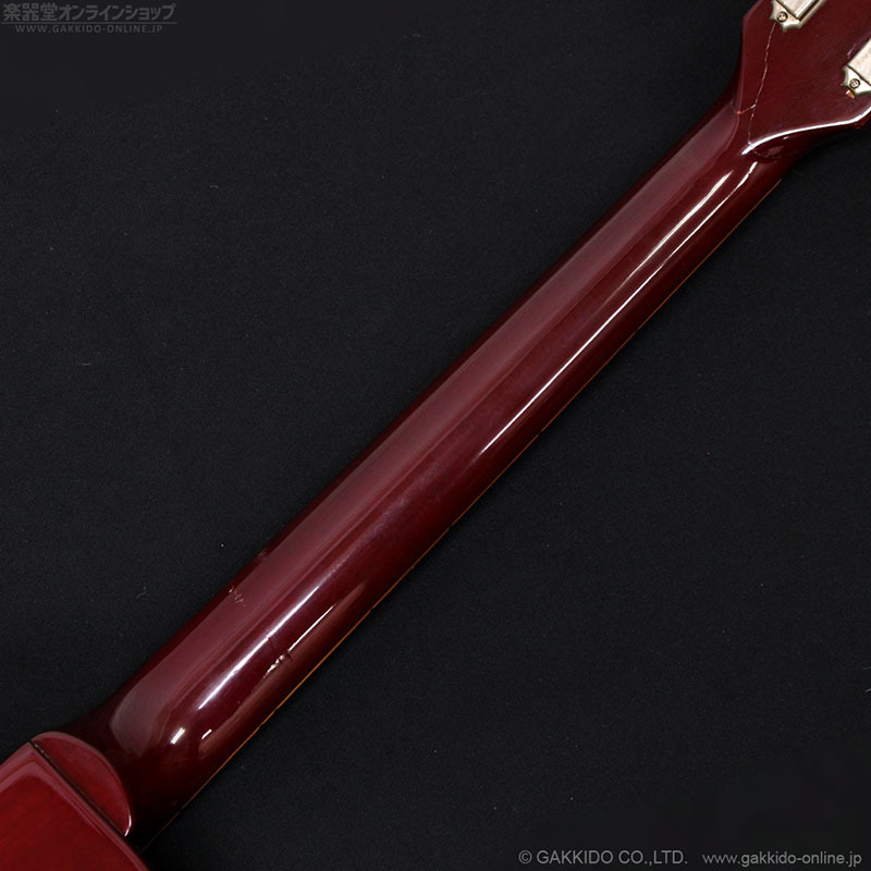 ネックのナット裏付近にネック折れをリペアした跡が見られます。その他11F裏付近とボディ下部のバインディングにスタンドによるラッカー焼けが少々見られます。また、写真ではなかなかお伝えしづらいですが、ボディ側面やネック裏は全体的にかなり細かな塗装クラックが見られます。