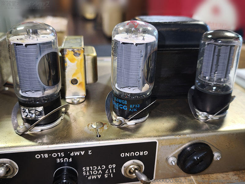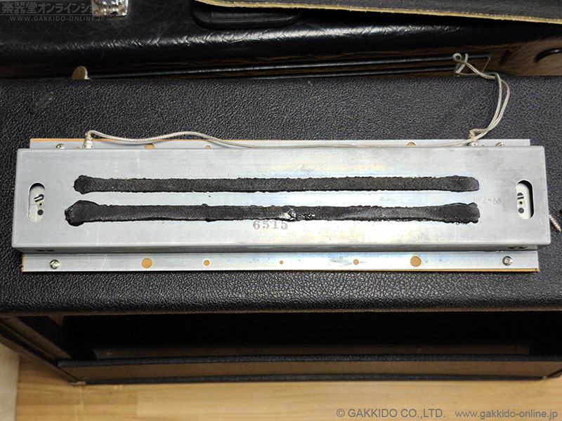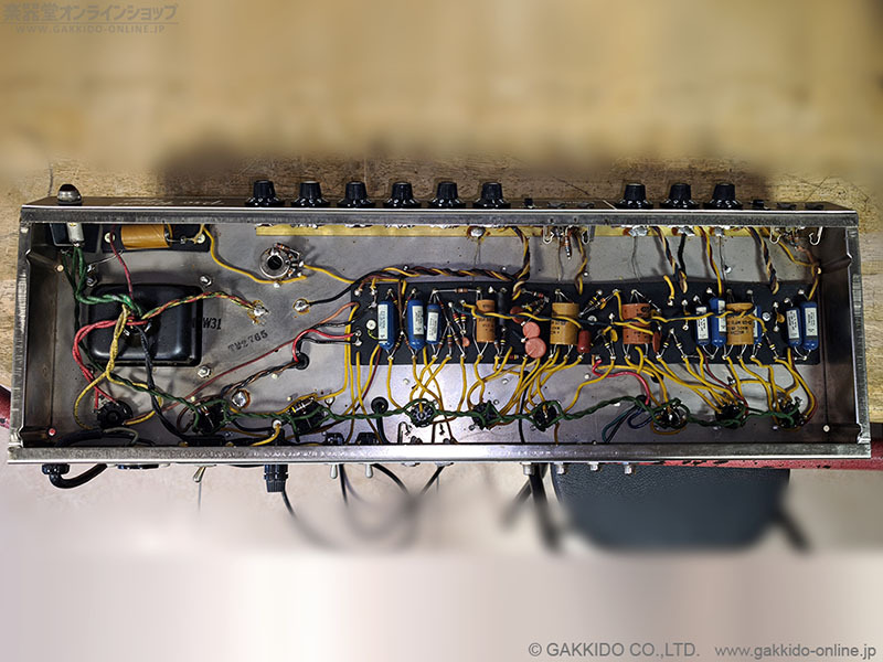 電源プラグ部分が2ピンタイプに交換、フットスイッチは現行タイプが付属。それ以外はオリジナルコンディションとみられ、真空管以外は'60s当時の姿を残しています。