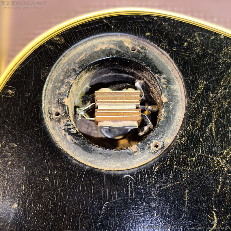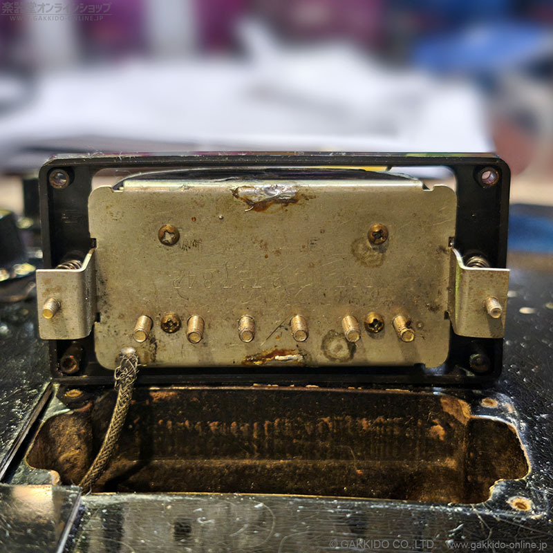 ピックアップはフロントがオリジナルのステッカードPAF、リアが少し後期の刻印ナンバーのTバッカーに交換されており、ともにカバーは取り外されてオープンとなっています。