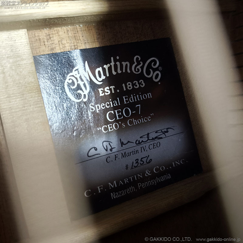 14Fジョイントの小ぶりな00ボディ、やや短めの24.9インチ(632mm)スケール、オータム・サンセット・バーストと名付けられたサンバーストカラーという、どうしてもG社のギターのシルエットを重ねてしまいそうな、一般的なマーティンギターとはちょっと異なる趣のあるモデルCEO-7の中古品。2015年製の正規輸入品です。