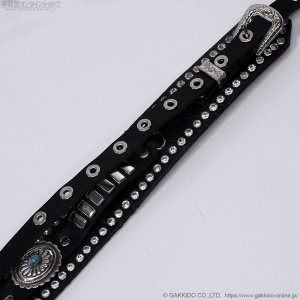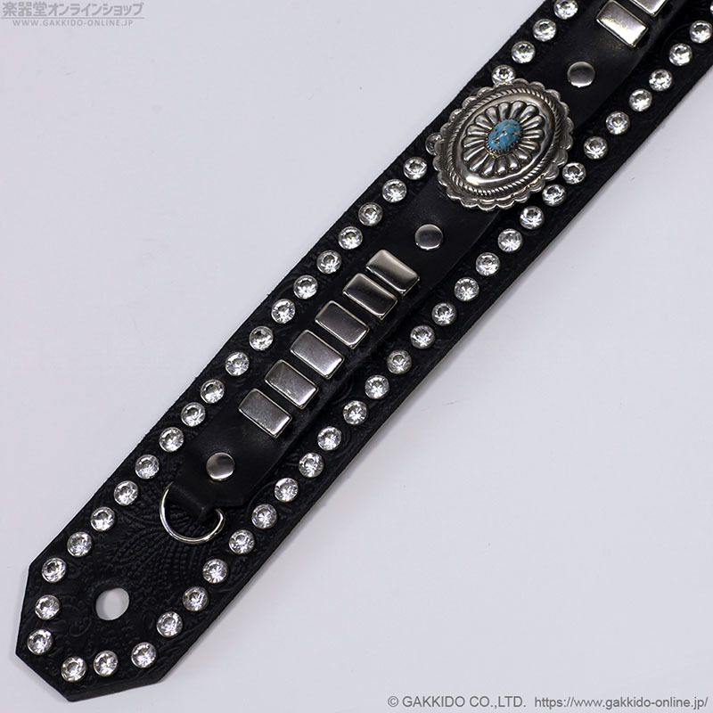 幅50mmの革にペイズリー型押し革を貼り付け、周りにグラスストーン、センターに4コンチョ&スタッズを装備したハード&ゴージャスなストラップです。