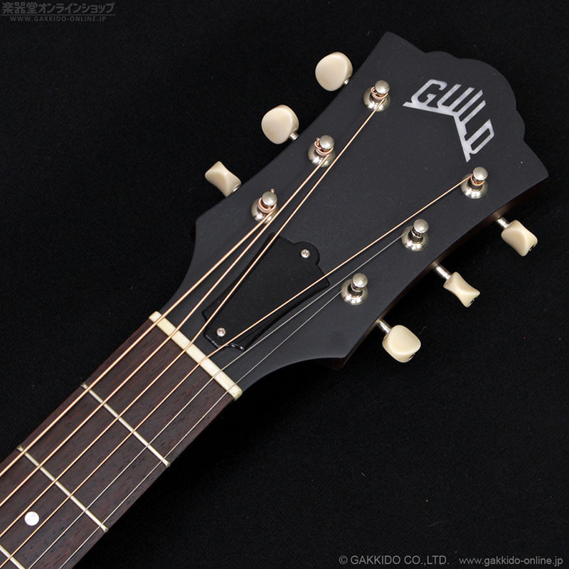 薄く仕上げられたサテン(艶消し)ニトロセルロース・ラッカー仕上げによる滑らかな手触り。ヴィンテージスタイルのロゼッタ、ヘッドストックにはめ込まれたギルドのピーク・ロゴなど、伝統的なギルド・デザインも見逃せません。