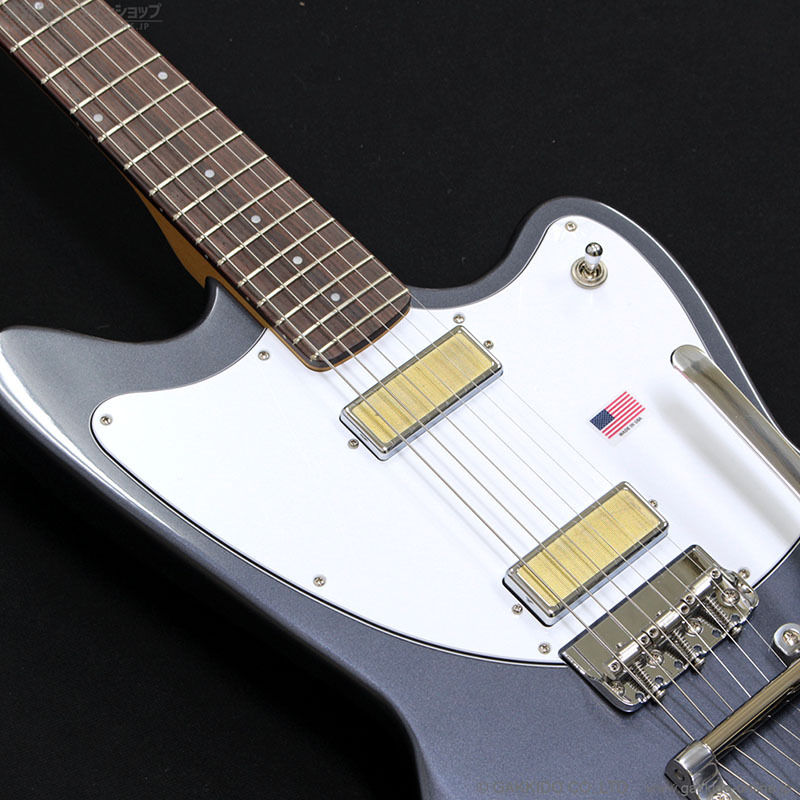 シルエットという名のこのギターは、ノンリバースのファイヤーバードシェイプのボディに、テレキャスター的なハードウェアや演奏性を持たせたモデル。こちらはビグスビー・トレモロ搭載仕様、スレートカラーのニトロセルロース・ラッカー仕上げ。