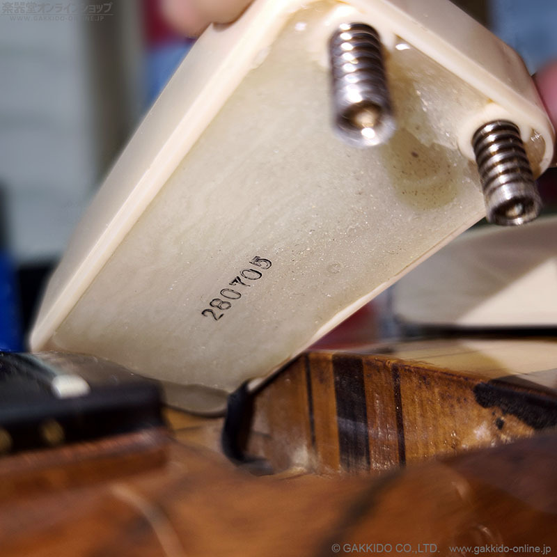 “Speed Way”と呼ばれるスリムCシェイプのボリュート付きネック、牛骨&ブラスによる俗にいう“ハーフアンドハーフ”ナット、当時としてはかなり斬新な8角ポストやトルク調整機構を備えたMHG900ペグ、様々なオリジナルパーツ等、フジゲンの技が光る、最高峰モデルの名に恥じないゴージャスなギターです。