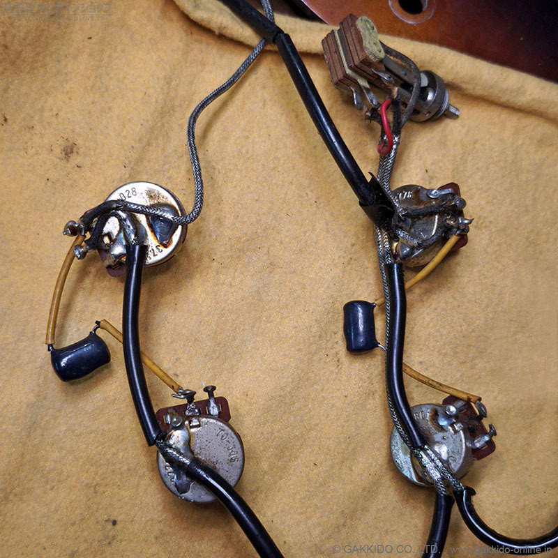 ナット、フレット、ペグ、アウトプットジャックと、ブリッジのパーツの一部(サドルや一部ネジ等)が交換されています。ピックアップ(スーパーハムバッカー)やポットはオリジナルです。