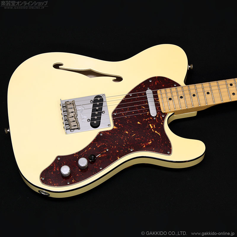 その名のとおり、伝統的なTelecaster Thinlineを、American Standardシリーズ等で見られるモダンなスペックで仕上げたギターとなっており、セミホロー構造のアッシュボディ、モダンCシェイプ・メイプルネック、9.5"R、22F(ミディアムジャンボフレット)指板、アメリカン・スタンダードタイプのブリッジ(ブラスプレート&ベントスチールサドル)、アメリカン・スタンダード・シングルコイルピックアップ×2基搭載。