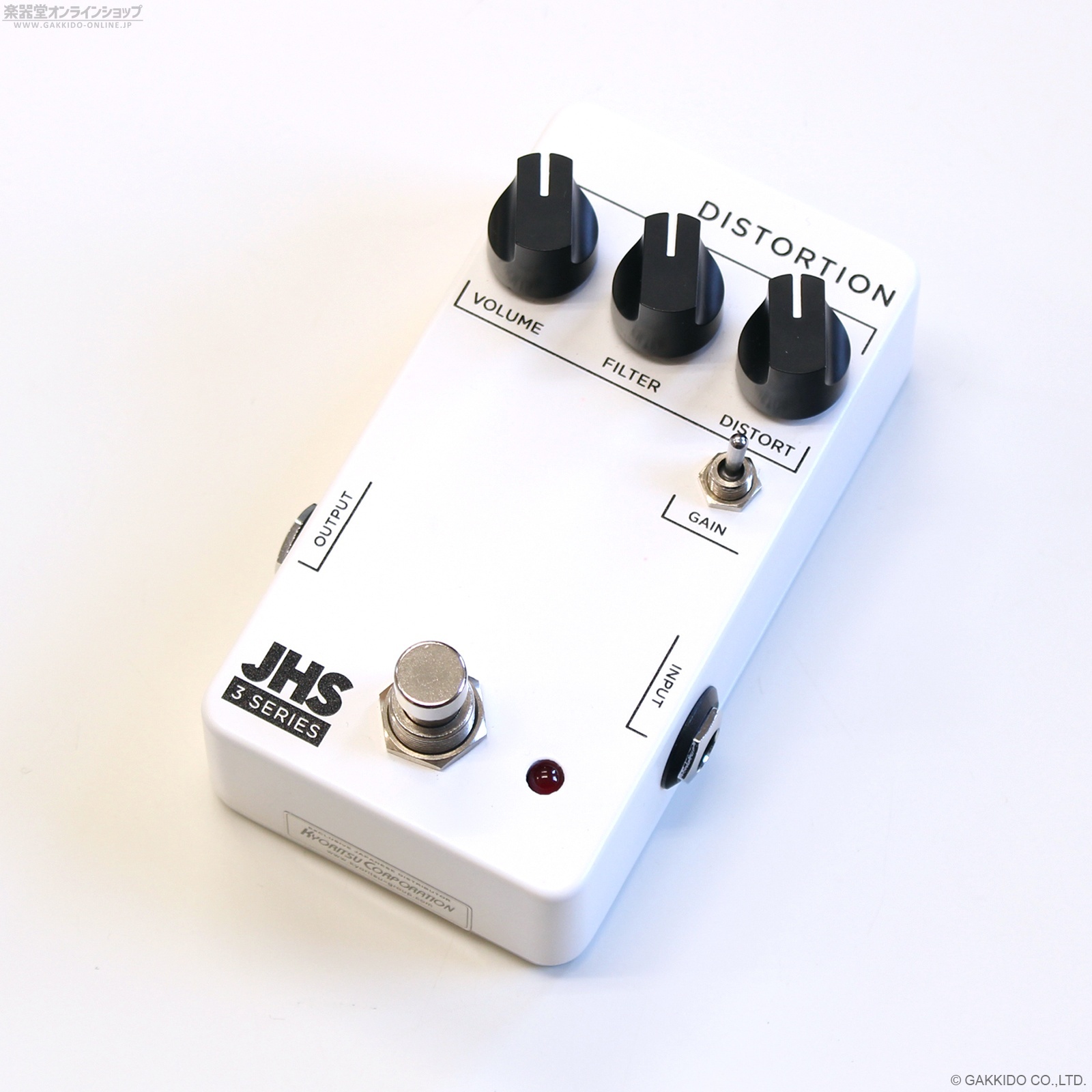 JHS Pedals 3 Series Distortion は、ミディアムゲインのクランチサウンド、ヘビーオーバードライブ、ディストーション、さらにはファズトーンまで実現する、非常に用途の広いディストーションペダルです。コントロールは Volume、Filter(Tone)、Distort で構成されており、どのポジションでも幅広いサウンドレンジに対応した様々なサウンドが得られます。Gain トグルスイッチでは、よりサチュレーションとコンプレッションを得たサウンドとオープンでエッジの効いたディストーションを切り替えます。このスイッチは、演奏やタッチダイナミクスに対するペダルのレスポンスに大きく影響します。