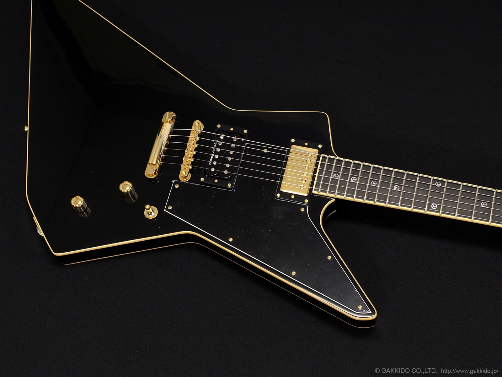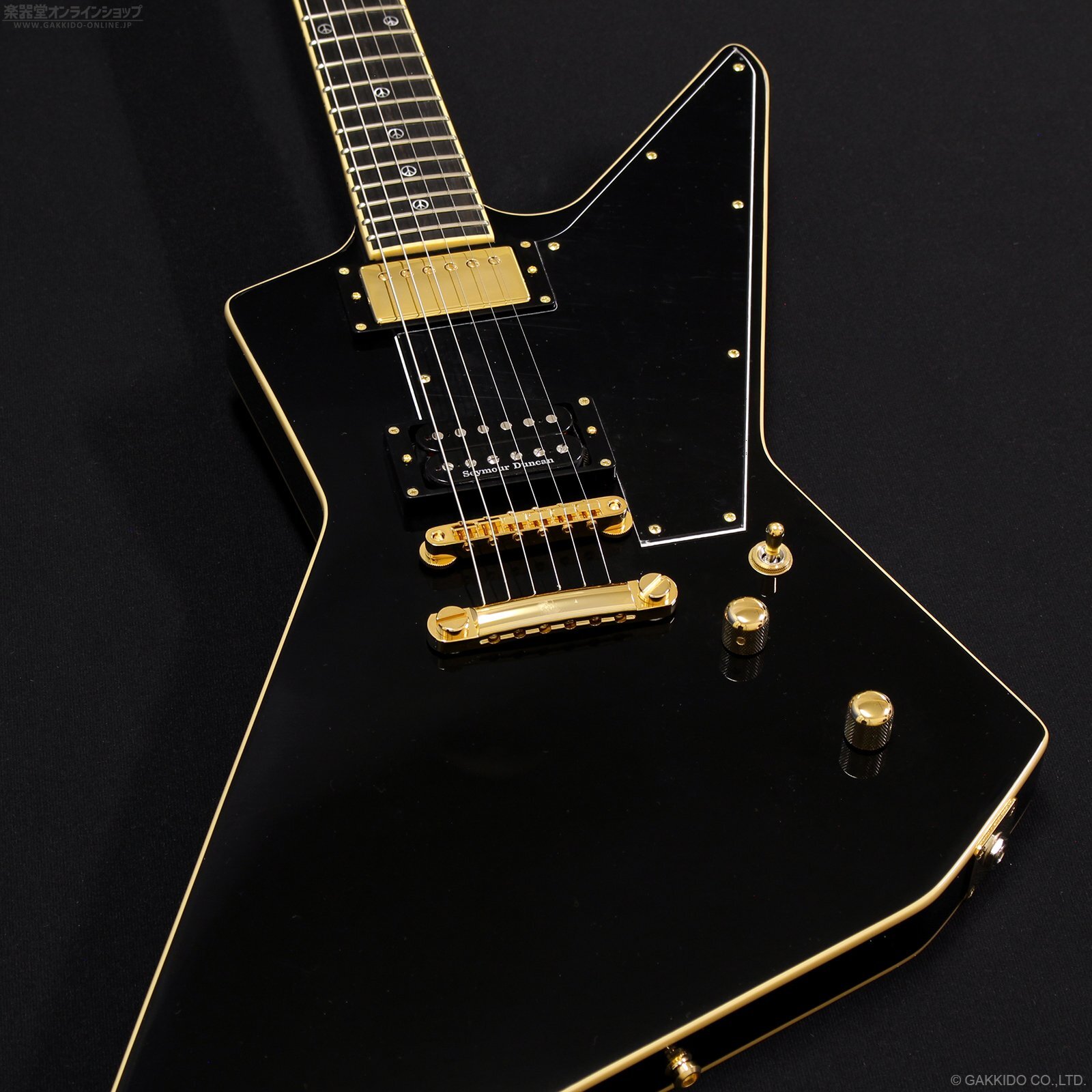 EX系オリジナルシェイプのバインディング付きマホガニーボディ、マホガニーネック&22Fエボニー指板(指板インレイはピースマーク!)。指板サイドポジションマークはステージでの視認性に優れた蓄光タイプです。