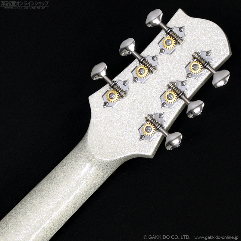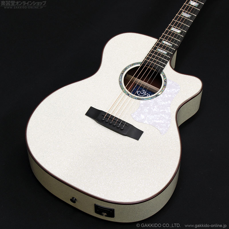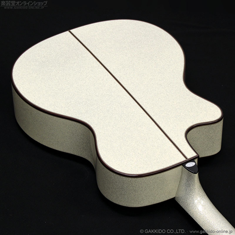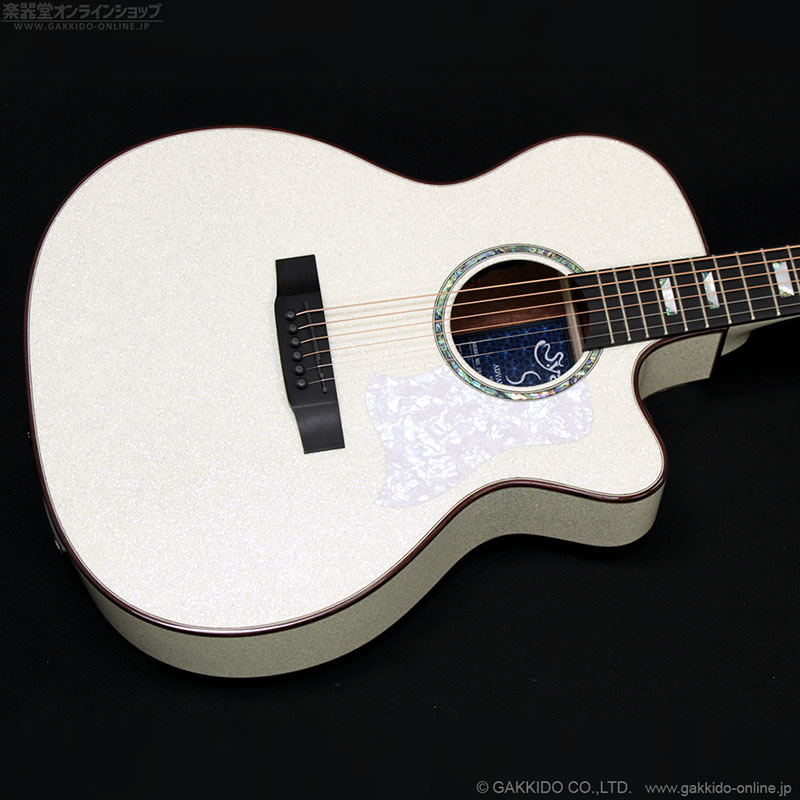 S.ヤイリ Advancedシリーズの超ゴージャスモデル。トップにスプルース単板、サイド&バックにサペリを使用したトラディショナルなカッタウェイ付きボディ、マホガニーネックを採用。カラーは見てのとおりインパクトバツグンのホワイト系スパークルカラーとなっています。