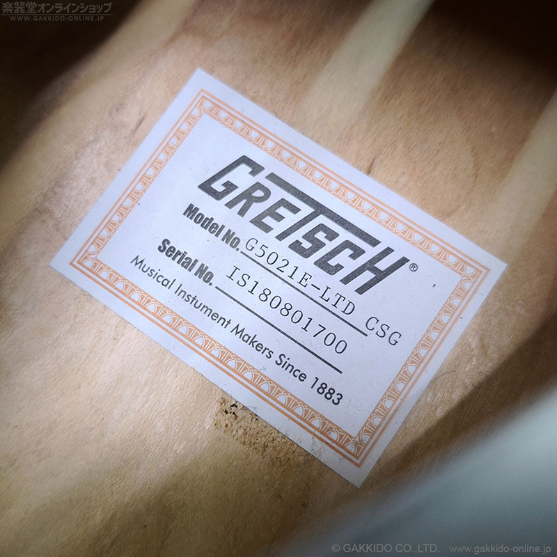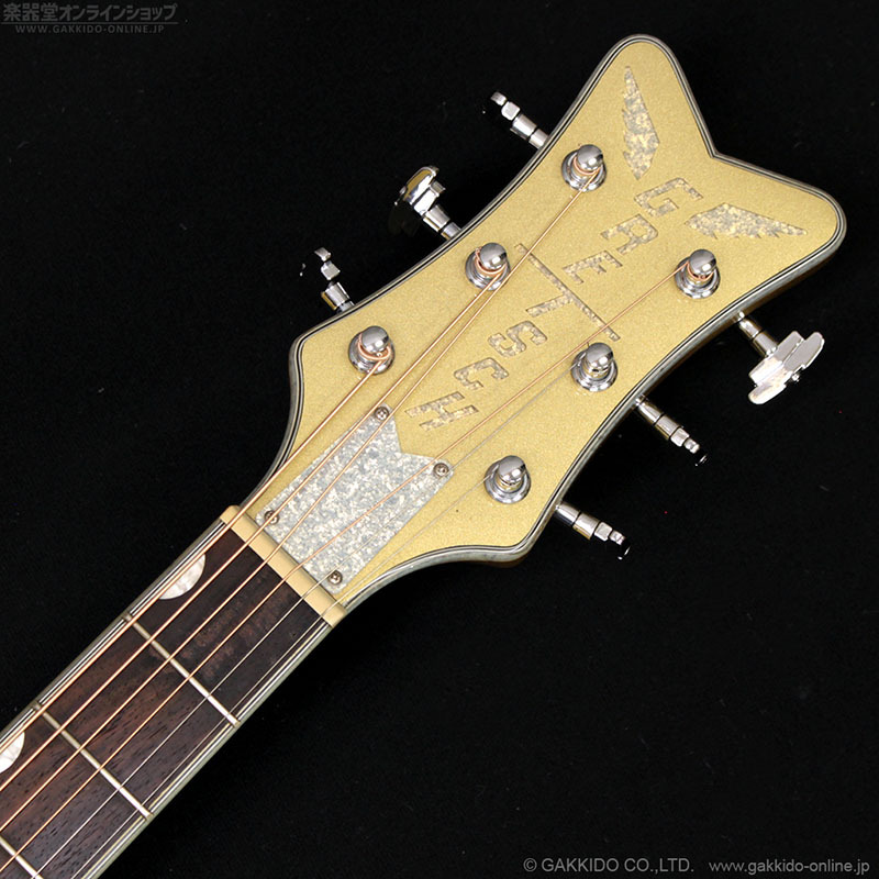 ソリッドスプルース・ボディトップ、メイプル・ボディバック&サイド、ボディとネックに施されたシルバースパークル・バインディング、指板のNeo-Classicサムネイル・インレイ、シルバーのプレキシピックガード、“バーティカルウイング”のグレッチ・ヘッドストックロゴなどを採用しています。